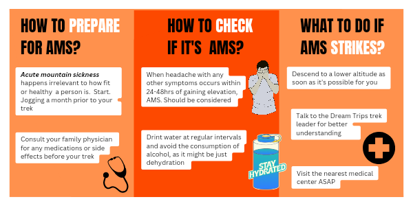 Acute Mountain Sickness (AMS), often called altitude sickness, is a condition that can affect trekkers and travellers at high altitudes – usually above 8,000 feet. When you reach these elevations, the air has less oxygen, and this sudden change in oxygen can make it harder for your body to adjust, causing symptoms of AMS. As a leading adventure travel company, Dream Trips ensures all trekkers are well-informed and prepared for these challenges, especially on high-altitude Himalayan treks. With Dream Trips expertise in high-altitude trekking, you can explore the stunning Himalayan landscapes with confidence. Every trek is designed with safety and acclimatization in mind, ensuring that you can fully enjoy the adventure while minimising the risk of AMS. Trust team Dream Trips to guide you through safe and unforgettable high-altitude experiences
